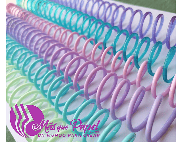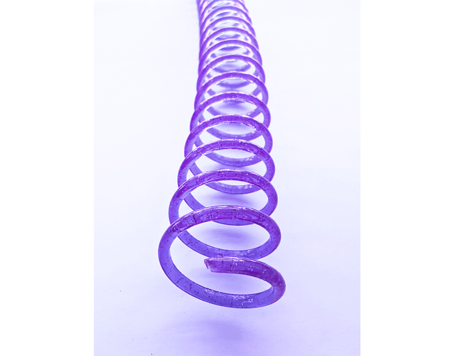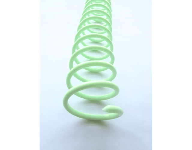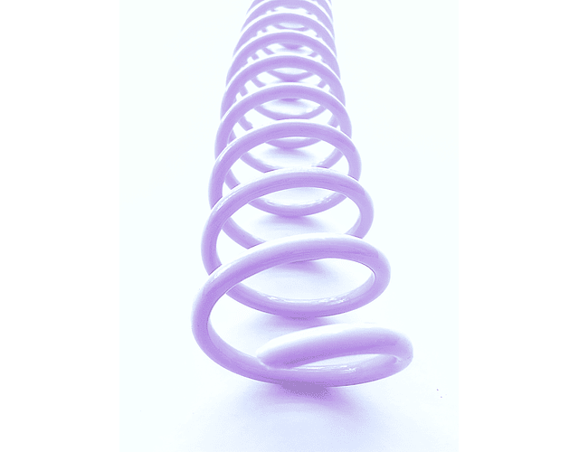 Espiral plástico de excelente calidad y bellos colores. Paso 2:1 para utilizar con anilladora cinch, wiremac u otras similares. Medida para aproximadamente 130 hjs de 105 grs más tapas.